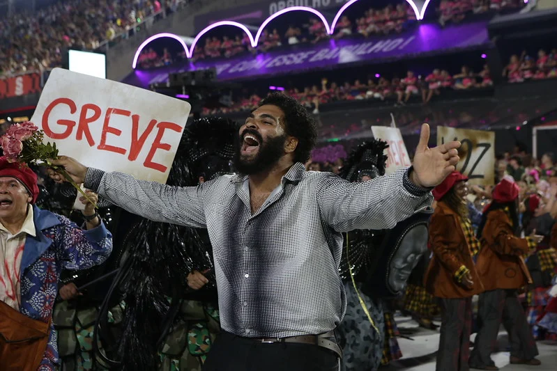 Ali, na passarela do samba, as caricaturas carnavalescas assumiram um papel didático de rara clareza. O golpismo histórico das elites contra a força ascendente do povo trabalhador foi encenado sem meias palavras. A perseguição ao movimento sindical, a repressão da ditadura e as manobras políticas que buscaram silenciar a voz do operário foram traduzidas em alas e alegorias que dispensavam legendas. A escola de samba, em sua vocação de cronista popular, expôs as feridas abertas de uma luta de classes que pulsa sob o verniz da cordialidade brasileira. A figura de um palhaço aprisionado, com tornozeleira eletrônica violada e feição de espanto, foi a representação satírica e contundente do golpismo recente, a cara de pau do autoritarismo finalmente encenada com a didática necessária para que a memória autoritária do bolsonarismo seja devidamente narrada não apenas pelos historiadores, mas pela festa popular mais impressionante do mundo.