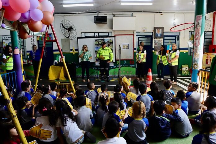 A atividade, que visa sensibilizar e educar as novas gerações sobre a importância da segurança viária, contou com a participação do agente de trânsito Arne Santos. Em uma interação direta com os alunos, ele abordou regras básicas de trânsito, a necessidade de respeitar as leis, os cuidados ao atravessar a rua e o comportamento adequado dentro do transporte público.