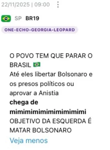 Os principais trechos de mensagens que circulam mencionam ainda um suposta “ditadura de toga” – em referência ao ministro Alexandre de Moraes do Supremo Tribunal Federal – e demonstram indignação contra aliados do ex-presidente, mas especificamente contra o deputado federal Nikolas Ferreira (PL-MG), chamado de “Pinikolas Iscariotes” nas conversas.