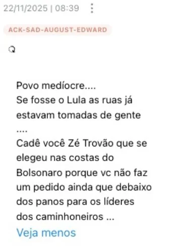 “Chegou a hora do Brasil se mobilizar. Chegou a hora do Brasil parar. Chegou a hora da gente ir pras ruas como a gente nunca foi antes. Chegou a hora da gente fazer muito mais do que nós fizemos lá em 2021, quando nós paramos toda a nossa nação. Quando o transporte rodoviário de cargas cruzou os braços em prol desse país. Quando o povo brasileiro foi às ruas e não saiu mais”, diz o parlamentar, em vídeo com mais de 172 mil visualizações e alcance de 15 mil usuários em grupos públicos de mensagerias.