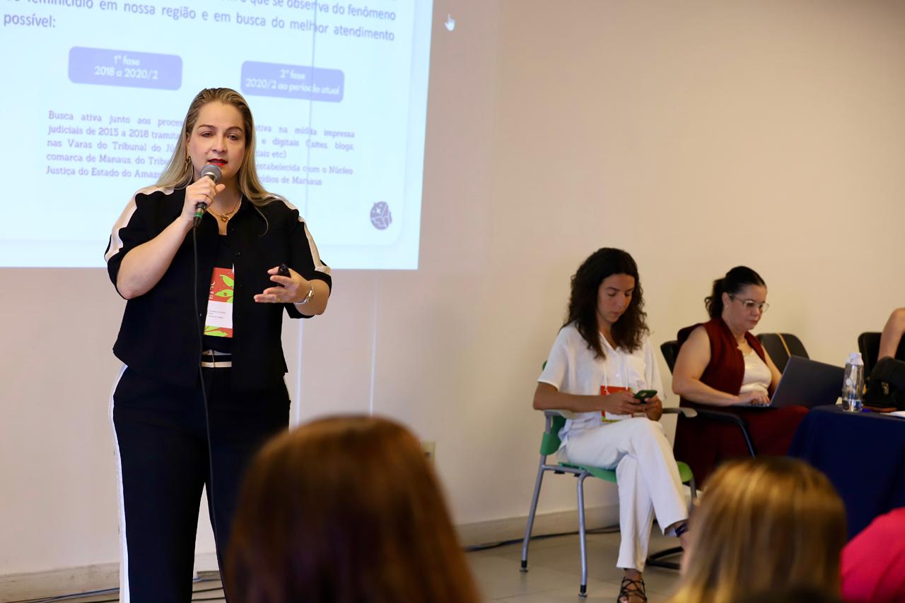 No painel “Cartografias dos Feminicídios no Brasil: entre o lar, o tráfico e o Estado”, a defensora pública Carol Braz explicou sobre a atuação do projeto, criado em 2018 pelo Núcleo de Promoção e Defesa dos Direitos das Mulheres (Nudem), desde a busca ativa das vítimas até o acompanhamento psicossocial, e também apresentou os resultados obtidos com este programa, além de reforçar a importância de políticas públicas intersetoriais no combate a esse crime.
