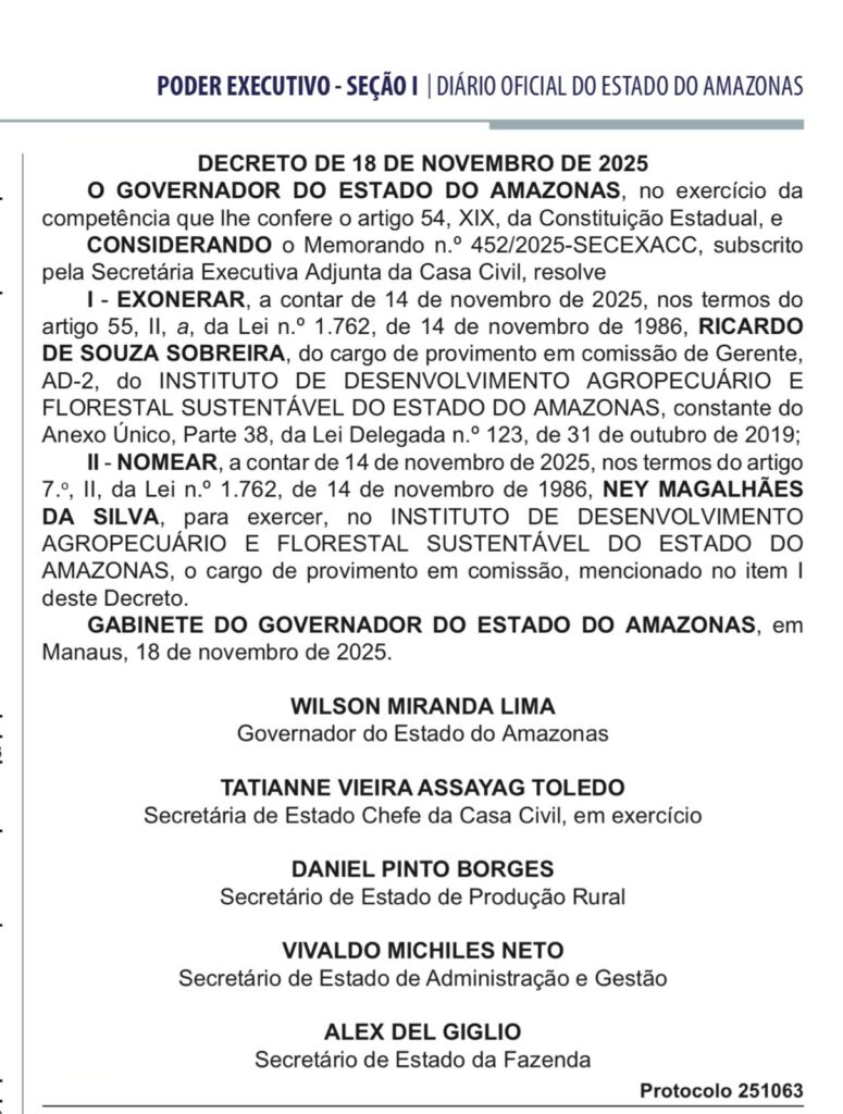 Ney Magalhães estava afastado do meio político desde Janeiro de 2025 e agora retorna para comandar o órgão mais importante do setor primário em Manaquiri, o Idam, responsável por executar as políticas públicas do setor primário do Governo do Estado.