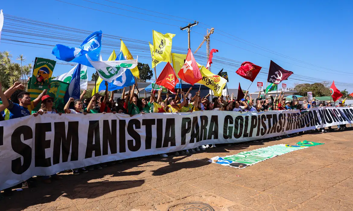 Em Brasília, o ato contou com faixas com mensagens como “Sem anistia para golpistas, ditadura nunca mais”; “Fora, ianques”; e “Em defesa da soberania nacional”.