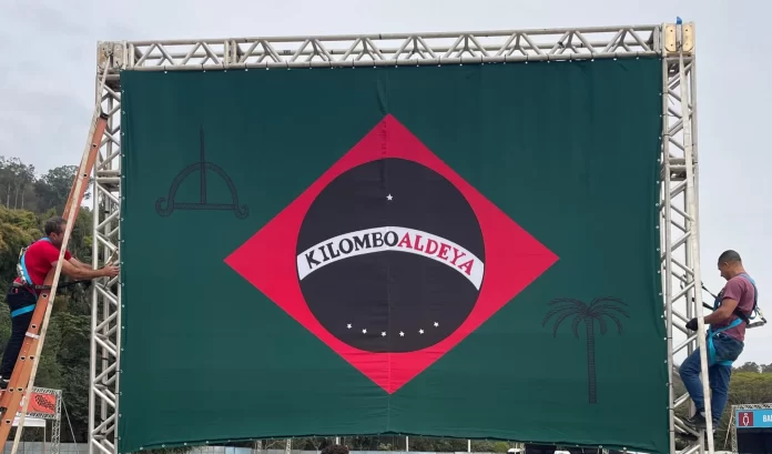 O trabalho faz uma releitura da bandeira nacional, substituindo os dizeres “ordem e progresso” por “Kilombo Aldeya” e estava exposta em um painel montado no Parque de Exposições de Itaipava.