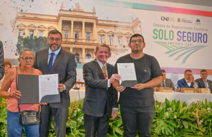 Com a perspectiva de 15 mil regularizações fundiárias a serem realizadas até o final deste mês de agosto, a edição regional da “Semana Solo Seguro Amazônia” foi concluída nesta sexta-feira (29/08) com solenidade realizada pelo Poder Judiciário Estadual, por meio da Corregedoria-Geral de Justiça do Amazonas (CGJ-AM), no Salão Solimões do Centro Cultural Palácio Rio Negro, em Manaus.