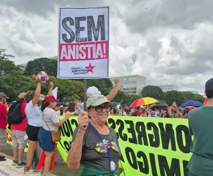 Na capital federal, os manifestantes se reuniram em frente ao Museu da República e se dirigiram ao Congresso, onde gritaram palavras de ordem e ergueram cartazes com os dizeres “Sem anistia para golpista”. Também houve criticas ao presidente da Câmara dos Deputados, Hugo Motta (Republicanos-PB).