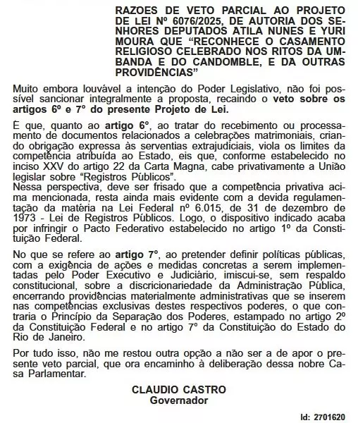 Apesar da sanção, o governador vetou dois artigos da proposta de lei enviada pela Alerj. Um deles determinava que a recusa injustificada de cartórios ao reconhecimento de autoridades religiosas pode ser configurada intolerância religiosa. Segundo Castro, o trecho trazia obrigações aos cartórios que só podem ser decididos pela União.