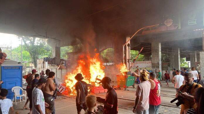Durante o protesto, moradores da favela atearam fogo em móveis e montaram barricadas nas ruas e nos trilhos do trem.